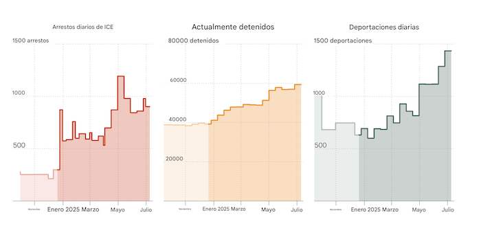 “Desde entonces, casi la totalidad del aumento en los arrestos se ha producido contra personas sin antecedentes penales. Los arrestos por inmigración de personas con antecedentes penales por delitos violentos aumentaron a aproximadamente mil 900 en junio, frente a los aproximadamente mil 100 de diciembre. Al mismo tiempo, los arrestos en general se triplicaron, superando los 28 mil, y los arrestos de personas sin antecedentes penales ni cargos se multiplicaron por casi 20. Pero el aumento repentino del verano experimentado en gran parte del país no duró. Los arrestos alcanzaron un promedio de casi 1200 al día a principios de junio, pero desde entonces el ritmo ha disminuido a los niveles de abril”, explica Sun.
