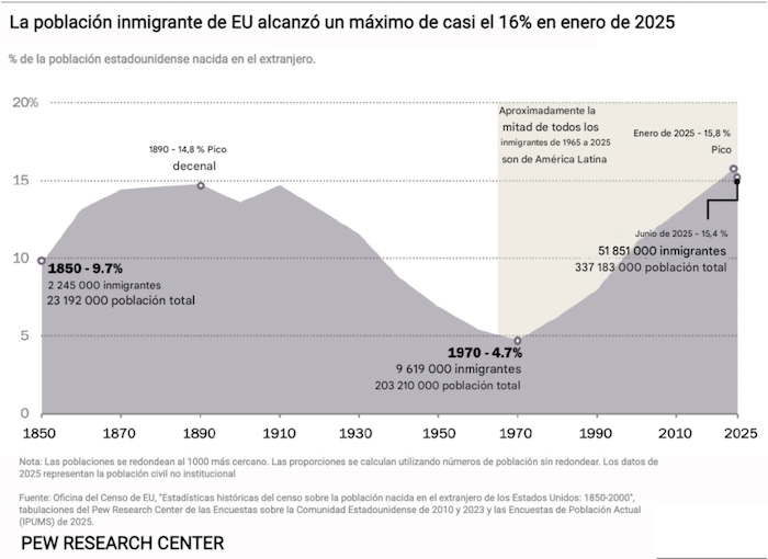 “Un análisis de los nuevos datos del censo, publicado el jueves por el Pew Research Center, una entidad independiente, reveló que, entre enero y junio, la población nacida en el extranjero en Estados Unidos, tanto residentes legales como indocumentados, disminuyó en casi 1.5 millones. En junio, el país albergaba a 51.9 millones de inmigrantes, una cifra inferior a los 53.3 millones registrados seis meses antes”, dice su análisis en el Times.