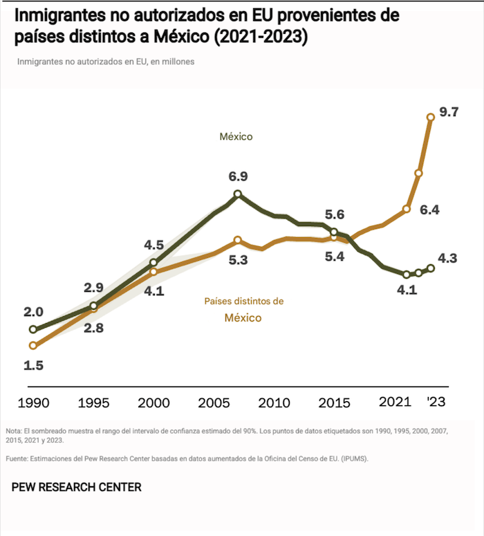 Los mismos datos muestran que el número de inmigrantes no autorizados en Estados Unidos provenientes de países distintos a México aumentó de 6.4 millones en 2021 a 9.7 millones en 2023. El Pew indica que la etiqueta "inmigrantes no autorizados" abarca una compleja gama de estatus, incluyendo a los inmigrantes que ingresaron legalmente a EU con estatus temporales y precarios.
