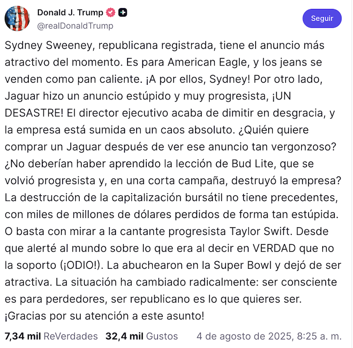 "Sydney Sweeney, una republicana registrada, tiene el anuncio 'MÁS CALIENTE' que existe. Es para American Eagle y los jeans están 'volando de los estantes'. ¡Ve por ellos, Sydney!", escribió Trump.
