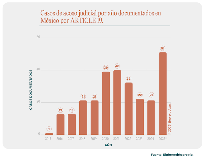 En México, en esta última década, la utilización de procesos judiciales contra la prensa ya se ha convertido en una tendencia común. Hasta este año, con 40 casos, el año 2021 había sido el año con más procesos abusivos documentados contra periodistas por sus publicaciones o investigaciones. No obstante, en tan sólo siete meses del 2025 ya sobrepasó lo registrado en el año con más casos.
