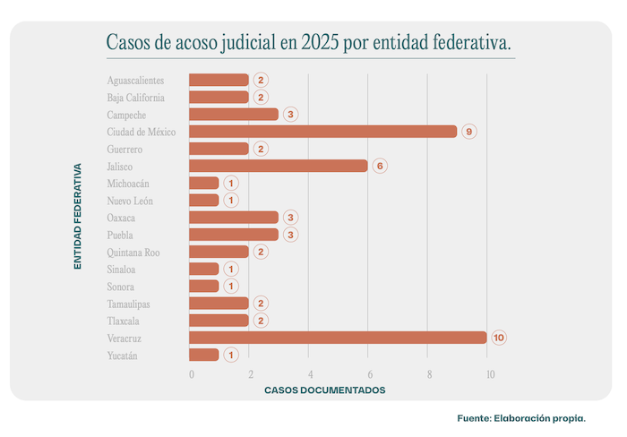 Los datos muestran que el 53 por ciento de las entidades federativas ya han registrado al menos un proceso de acoso judicial contra periodistas o medios de comunicación. Esto demuestra que no son algunas personas quienes están abusando del sistema, sino que es una práctica reiterada en el territorio nacional. Los tres estados con más procesos iniciados contra periodistas son Veracruz (10 casos), Ciudad de México (9), y Jalisco (6), siguiéndoles Campeche, Oaxaca y Puebla con 3 casos cada uno.