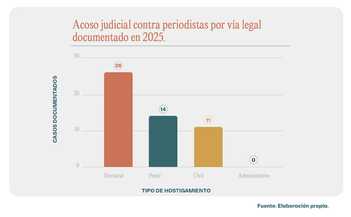 El acoso documentado por Artículo 19 también implica la utilización de distintas vías legales, tanto ministeriales como judiciales, para acosar a quienes ejercen su libertad de expresión. De los 51 casos de acoso judicial documentados, 26 fueron por la vía electoral (50.98 por ciento), 14 por la vía penal (27.45 por ciento), y 11 civiles (21.57 por ciento).
