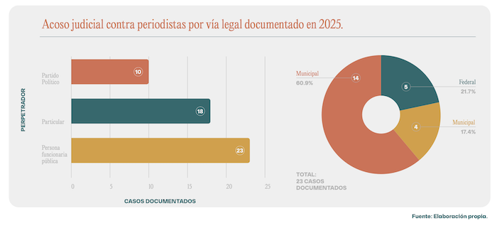 Al dar a conocer su reporte “Las leyes como mecanismo de censura: Aumento del acoso judicial contra periodistas en México”, Artículo 19 dijo que en tan sólo siete meses de este 2025 se ha superado el número de víctimas registradas en cualquier año anterior. “La violencia contra la prensa ya no se limita a agresiones físicas o amenazas: ahora se traslada a los tribunales mediante demandas, denuncias y procedimientos administrativos o electorales”.