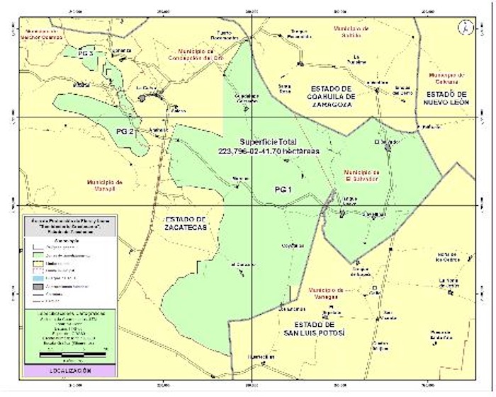 Salvo la zona donde opera la mina Aranzazú por el amparo ejidal, 223 mil 796 hectáreas de los municipios de Concepción del Oro, Mazapil y El Salvador fueron declarados por la Comisión Nacional de Áreas Protegidas (Conanp) como Área Natural Protegida en 2024.