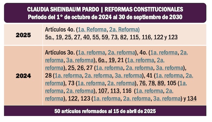Originalmente la presidenta Claudia Sheinbaum Pardo propuso en su iniciativa de reformas constitucionales que la prohibición del nepotismo electoral y la anulación del principio de reelección quedaran sin efecto a partir de los comicios del año 2027. Sin embargo, en el Senado de la República y en la Cámara de Diputados del Congreso de la Unión, coordinadas por los morenisas Adán Augusto López Hernández y Ricardo Monreal Ávila, respectivamente, decidieron enmendarle la plana a la mandataria nacional y posponer hasta el 2030 la aplicación de las referidas reformas.