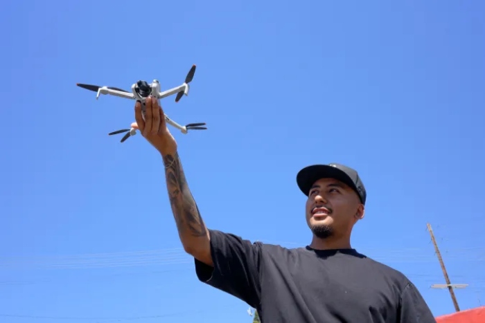 Marvin Valencia muestra el drone que pudo comprar con el apoyo de sus seguidores. Foto: Isaac Ceja, La Opinión.