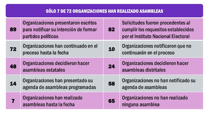 Luego de siete meses de iniciado el proceso, sólo siete de 89 organizaciones de ciudadanos que notificaron al Instituto Nacional Electoral (INE) su intención de participar en el proceso para formar nuevos partidos políticos han realizado asambleas estatales o distritales. De las 89 organizaciones que expresaron su intención, sólo 82 pasaron el primer filtro de requisitos establecidos por el INE, pero hasta la fecha, diez han notificado su retiro de la contienda.