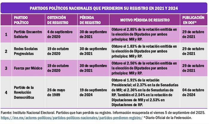 El día de la sesión del Consejo General en la que se conozca el informe referido, en marzo del 2026, comenzará a computarse el plazo de 60 días en los que el INE debe resolver que organizaciones cumplieron los requisitos de ley para convertirse en nuevos partidos políticos. Se expediría el certificado correspondiente, mismo que surtiría efectos a partir del 1 de julio de 2026. Para validar y conservar su registro, los nuevos partidos políticos tendrían que lograr por lo menos el 3 por ciento de la votación total del país en la contienda para diputados federales de junio del 2027.