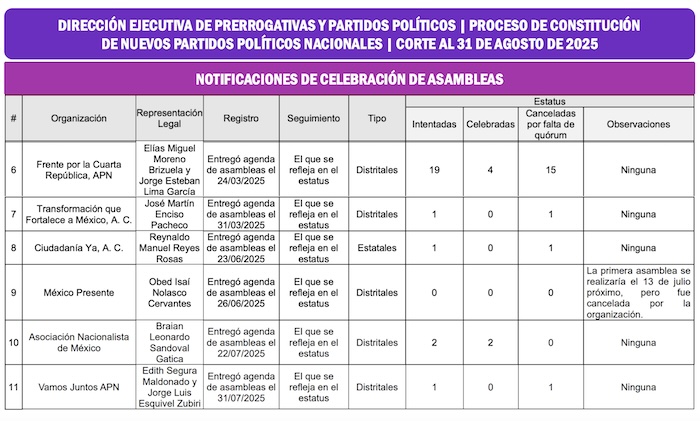 Las organizaciones promoventes de partidos políticos podrán presentar dos tipos de listas de afiliados: las que contengan los nombres de quienes asistan a sus asambleas y las de quienes sean inscritos en el resto del país mediante una aplicación móvil o con documentos en papel, en donde no sea posible hacerlo con instrumentos electrónicos. La organización promovente de partido político deberá informar a la Dirección Ejecutiva de Prerrogativas y Partidos Políticos del INE (DEPPP), la celebración de su asamblea nacional constitutiva, la cual deberá celebrarse a más tardar el 25 de febrero de 2026.