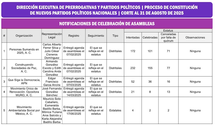 Hasta el corte del pasado domingo 31 de agosto del 2025, la organización denominada Construyendo Sociedades de Paz, que promueve un partido político con ese mismo nombre, era la que mostraba más avances pues sumaba 155 asambleas distritales de las 200 que tendría que llevar a cabo, cuando faltarían menos de seis meses para que se cumpla el plazo para la realización de su asamblea nacional constitutiva, que de acuerdo con las reglas establecidas por el INE tendría que llevarse a cabo a más tardar el 25 de febrero del 2026.
