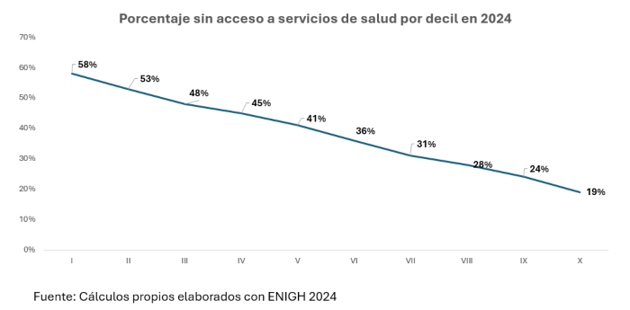 Según la ENIGH, en 2024, 63 por ciento de la población mexicana, equivalente a 82 millones de personas, declaró tener acceso a servicios de salud pública, es decir, sí contaba con un sistema de salud que le brindaba atención. Sin embargo, de forma preocupante, 37 por ciento de la población, equivalente a 48 millones de personas, declaró no contar con acceso a servicios de salud pública. (ENIGH 2024). Los datos también revelan que las personas con menores ingresos en el país y que están en mayor situación de pobreza y marginación, tienen menor acceso servicios de salud. Como muestra la gráfica, 58 por ciento y 53 por ciento de los hogares en los deciles I y II, que son quienes tienen menores ingresos, carecen de este acceso, mientras que, en los hogares en el decil IX y X con los mayores ingresos, sólo 24 por ciento y 19 por ciento carecen de acceso.