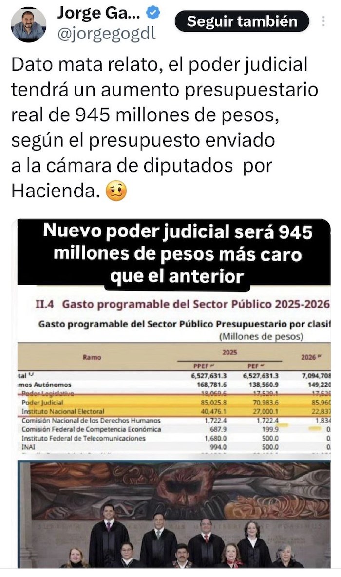 El dato de los 945 millones es la diferencia entre lo solicitado para este año y lo que solicitó el Poder Judicial para 2025. A partir de esa publicación, distintas cuentas de X comenzaron a difundir mensajes como “¿pos no que era muy caro el anterior Poder Judicial?”, o “de nuevo les vieron la cara con la austeridad”. “Salió más caro el acordeón”, publicó el comentarista energético Víctor Ramírez. “Son menos y gastan más”, dijo Amado Avendaño, del grupo político #SomosMX. “Y para colmo saldrá más cara”, publicó el caricaturista del periódico Reforma Paco Calderón. “Aquí la ‘austera justicia del Bienestar’ que prometieron”, escribió la periodista de TV Azteca, Lucy Bravo.