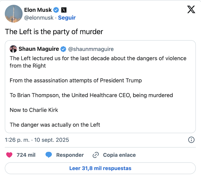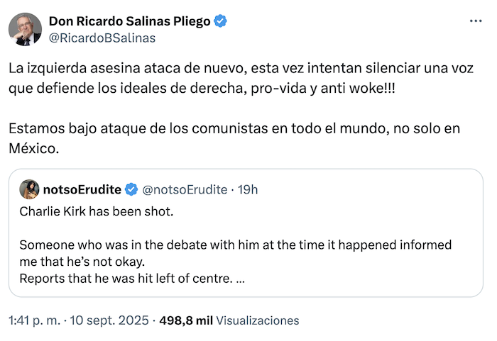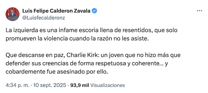 Ciudad de México, 12 de septiembre (SinEmbargo).– La ultraderecha mexicana señaló, desde un primer momento y sin presentar pruebas, que detrás de la muerte de Charlie Kirk se encontraba la izquierda. “La izquierda asesina ataca de nuevo, esta vez intentan silenciar una voz que defiende los ideales de derecha, pro-vida y anti woke!!!”, escribió, por ejemplo, Ricardo Salinas Pliego. “La izquierda es una infame escoria llena de resentidos, que sólo promueven la violencia cuando la razón no les asiste”, escribió a su vez Luis Felipe Calderón Zavala, hijo de Felipe Calderón. Así como ellos, otros perfiles han lamentado el asesinato como Eduardo Verástegui, un aliado de Donald Trump.