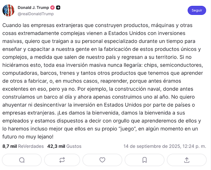 Pese a ello, Trump insistió en su mensaje del domingo que buscaba que “las empresas extranjeras que construyen productos, máquinas y otras cosas extremadamente complejas” lleven a Estados Unidos su personal especializado “para enseñar y capacitar a nuestra gente en la fabricación de estos productos únicos y complejos, a medida que salen de nuestro país y regresan a su territorio”.
