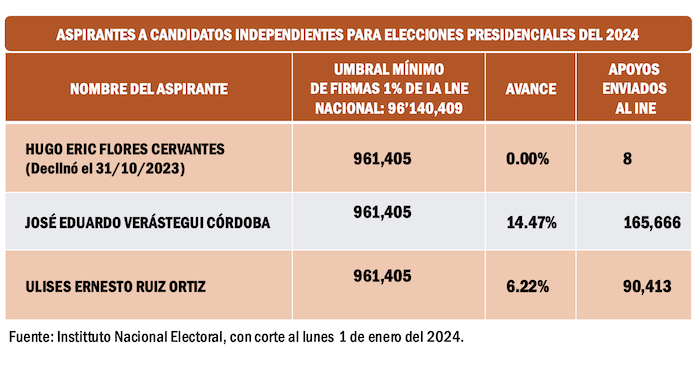 Un informe del Instituto Nacional Electoral con corte al lunes 1 de enero del 2024, detallaba que Verástegui Córdoba apenas había sumado 165 mil 666 firmas de apoyo y le faltaron 795 mil 739 para cumplir con la cuota mínima que le exigía la ley.