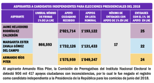 El antecedente de estos esfuerzos por llegar a la boleta por la vía independiente está en el 2018, cuando hubo 87 ciudadanos interesados en ser candidatos independientes a la Presidencia de la República, pero sólo 48 cumplieron los requisitos para ser autorizados a recopilar firmas de apoyo. Solo 22 terminaron el proceso pero en la boleta únicamente aparecieron dos para los comicios del domingo 1 de julio del 2018: la expanista Margarita Zavala Gómez del Campo y el expriista Jaime Heliodoro Rodríguez Calderón, conocido con el alias de “El Bronco”.