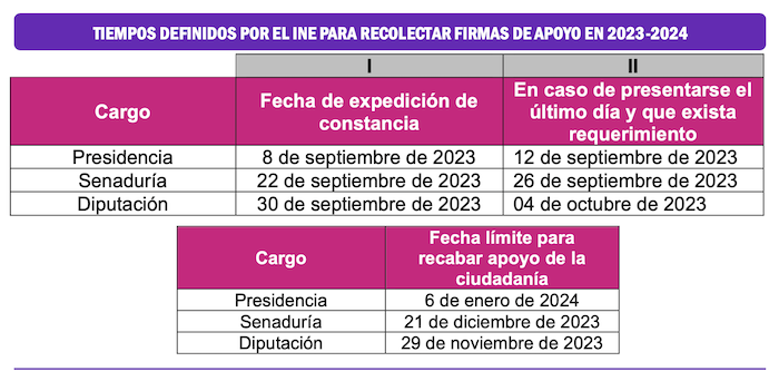 En la convocatoria para los aspirantes a candidatos independientes para los comicios del 2024 se estableció que podrían empezar a recolectar firmas de apoyo a partir del día siguiente a la fecha en la que el Instituto Nacional Electoral emitiera la constancia oficial de que cumplía los requisitos de ley. Los tiempos para el proceso de quienes aspiren a ser candidatos independientes a cargos federales en el 2030 no serán diferentes y empezarán a definirse a finales del 2029.