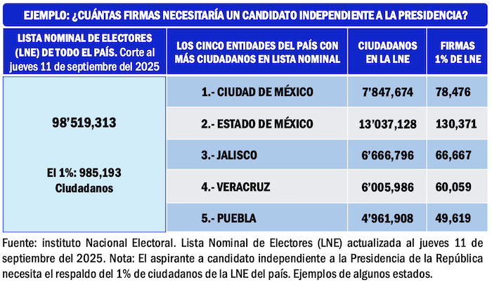 Sólo como punto de referencia, actualmente la Lista Nominal de Electores del país, con corte al jueves 11 de septiembre del 2025, tiene 98 millones 519 mil 313 personas inscritas, con credencial para votar. Esto significa que quien aspirara a ser candidato independiente a la Presidencia de la República con esa Lista Nominal de Electores tendría que sumar las firmas de apoyo de 985 mil 193 ciudadanos, distribuidos en por lo menos 17 entidades del país.