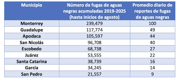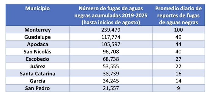 Otros municipios con una cantidad importante de fugas reportadas entre 2019 e inicios de agosto de 2025 son Escobedo con 68 mil 738 casos, el equivalente a 27 diarios; Juárez con 53 mil 555 reportes, el equivalente a 22 diarios y Santa Catarina con 38 mil 739 incidencias, el equivalente a 16 diarias.