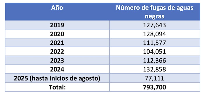 En total suman 793 mil 700 fugas de aguas negras acumuladas en seis años, lo equivale a 10 mil reportes mensuales, 330 quejas diarias o casi 14 cada hora.
