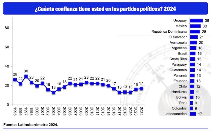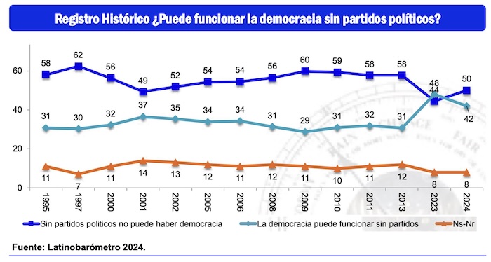 Por otra parte, en nuestro país hay un 54 por ciento de la población que le concede el privilegio de la duda a los partidos políticos, al considerar que sin ellos no podría haber vida democrática en la República, según reflejan los resultados del Latinobarómetro 2024, una encuesta continental que incluye a la mayoría de los países de América Latina.