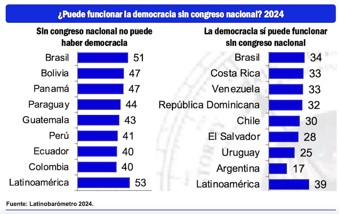 La situación con respecto a los congresos nacionales no es diferente en el resto de América Latina, pues en promedio, el 53 por ciento de los ciudadanos les consideran de utilidad, pero también hay un 39 por ciento de personas, en promedio, que opina que la vida democrática sería mejor sin la presencia de los legisladores.