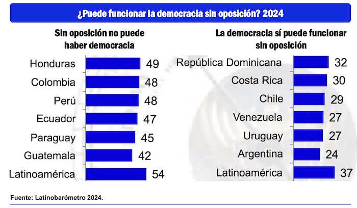 El registro del Latinobarómetro 2024 refleja que en México el 57 por ciento de las personas considera que sin oposición no podría haber democracia. Pero es tan precaria la presencia de la oposición en el país que el 36 por ciento de los ciudadanos reconoce que su presencia no es indispensable. En promedio, en América Latina, el 54 por ciento sí considera necesaria la presencia de la oposición, pero hay un 37 por ciento de ciudadanos que no la estima importante.