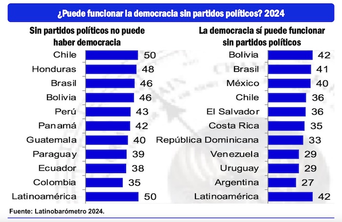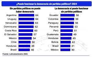 En esta amplia región el 50 por ciento de la población, en promedio, estima que los partidos políticos son útiles para la democracia, pero en contraste, el 42 por ciento de población de América Latina, en promedio, asegura que se podría vivir sin ellos.