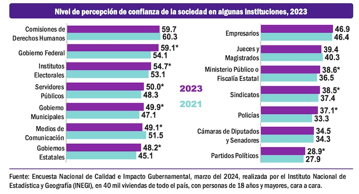 El poco aprecio de los ciudadanos por los partidos políticos está eflejado también en la encuesta anual de Calidad e Impacto Gubernamental 2024, realizada por el Instituto Nacional de Estadística y Geografía (INEGI), en la cual esas instituciones apenas alcanzan el 28.9 por ciento de la confianza de los ciudadanos en el 2023, contra el 27.9 por ciento durante el 2021.
