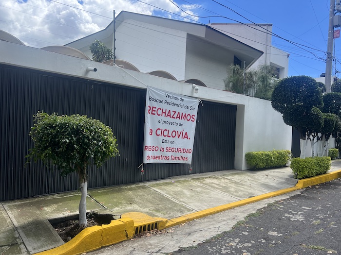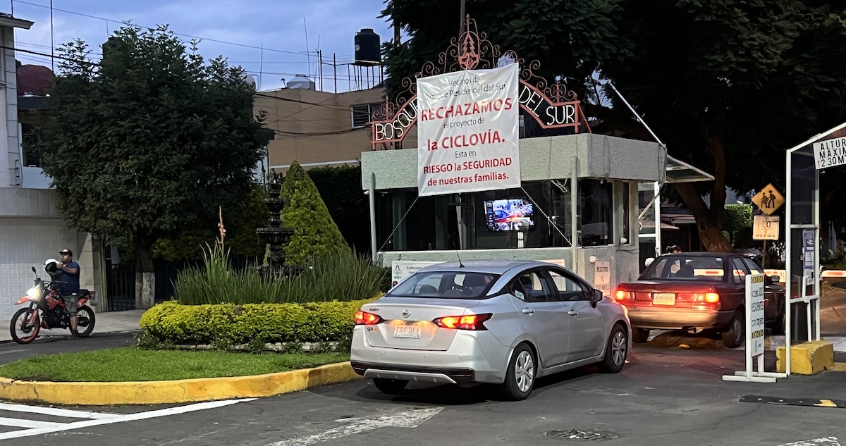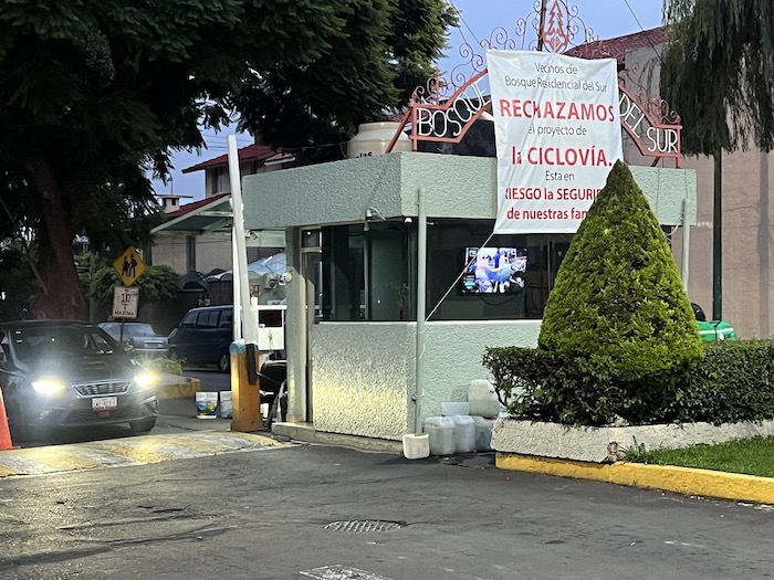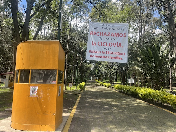 Varios arcos y el letrero gigante “Bosque Residencial del Sur” dan la bienvenida a sus habitantes por la Avenida San Lorenzo, cerca de la Avenida División del Norte. Un par de casetas de seguridad marcan las fronteras de esta colonia con el mundo exterior. Pero desde hace unos meses a la entrada se le ha agregado otro elemento: una manta que alerta “No a la ciclovía”.