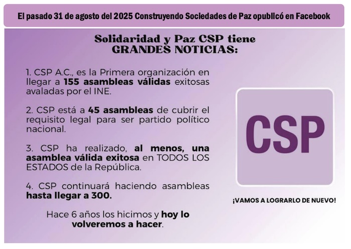 Hasta el corte de este miércoles 1 de octubre del 2025, la organización Construyendo Sociedades de Paz, que promueve un partido político con ese mismo nombre, tenía registrados ante el INE 108 mil afiliados, que representan el 42.35 por ciento de los 256 mil 30 que son necesarios para aspirar al registro oficial como partido político nacional.