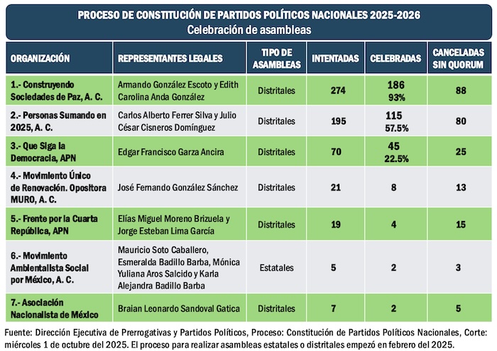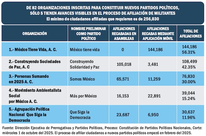 La organización que hasta el último corte, correspondiente al miércoles 1 de octubre del 2025 tenía mayores avances en la afiliación de simpatizantes, en su propósito de constituirse como partido político nacional, es México Tiene Vida A. C., que oficialmente ha registrados ante el Instituto Nacional Electoral 144 mil 186 personas. En tanto que en lo que corresponde a asambleas realizadas en ocho meses, quien aparece en primer lugar es la organización Construyendo Sociedades de Paz, con 182 asambleas distritales realizadas y un total de 108 mil 499 afiliados, el 42.35 por ciento del mínimo que le exige la ley.