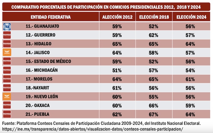 El PRI aparece como número cuatro en la lista de los cinco estados con porcentajes más altos de votación, en tanto que Movimiento Ciudadano permanece con una entidad en la lista de los cinco estados del país que tienen las Listas Nominales de potenciales votantes más numerosas, pero con un porcentaje bajo de participación, según se desprende de los datos más actualizados que ofrece el Instituto Nacional Electoral, en la Plataforma de Conteos Censales de Participación Ciudadana 2009-2024. El promedio nacional de participación en los comicios del 2024 fue del 59.7 por ciento según concluye el Instituto Nacional Electoral.