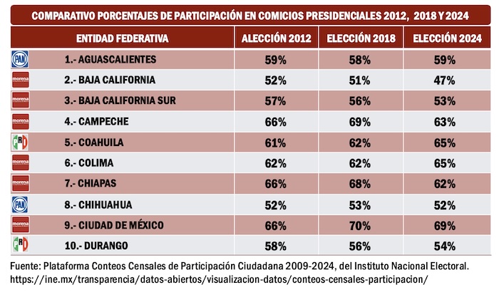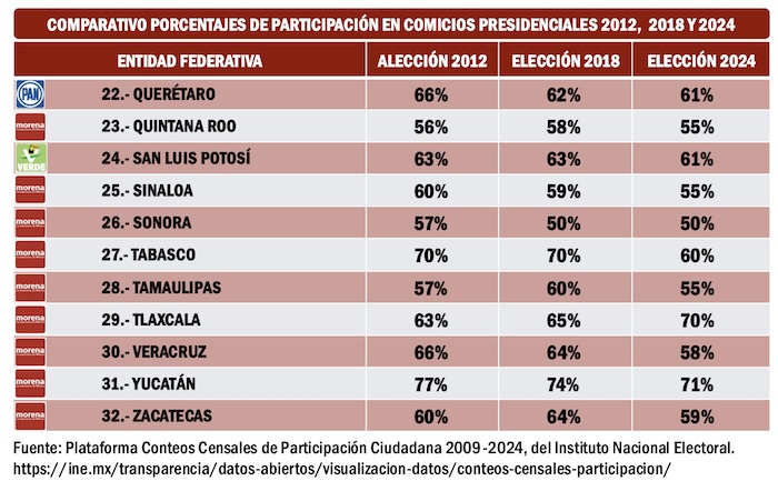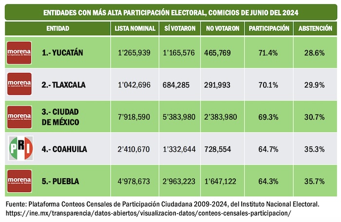 En los más recientes comicios federales de junio del 2024 Morena le arrebató al PAN la gubernatura de Yucatán, con su candidato Joaquín Jesús Díaz Mena, y esa entidad aparece como la número uno en la lista de los estados con más alto porcentaje de participación, con un impresionante 71.4 por ciento. En ese mismo paquete podríamos ubicar al estado de Tlaxcala, gobernado por la morenista Lorena Cuéllar Cisneros, que en junio del 2024 tuvo un porcentaje de participación del 70.1 por ciento.