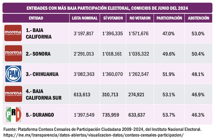 Completan la lista de las cinco entidades con más baja participación ciudadana en los más recientes comicios federales, los de junio del 2024, el estado de Baja California Sur, donde administra el morenista Víctor Manuel Castro Cosío, con promedio de presencia ciudadana en las urnas del 53.1 por ciento y cierra esta lista, en la parte baja de la tabla el estado de Durango, gobernado por el priista Esteban Alejandro Villegas Villarreal, donde acudió a votar el 53.7 por ciento de la gente, según conclusiones de la Plataforma de Conteos Censales de Participación Ciudadana 2009-2024, del Instituto Nacional Electoral.