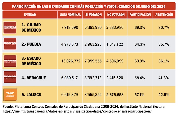 Otro importante granero de sufragios para Morena es la Ciudad de México, gobernada por Clara Brugada, que se ubica como la tercera entidad del país con el más alto porcentaje de votación en las más recientes elecciones constitucionales, cuando marcó una participación ciudadana del 69.3 por ciento. Pero, además, habría que agregar que la capital del país es la segunda entidad de la República con la más numerosa Lista Nominal de Electores, es decir, de personas que tienen credencial de elector vigente. Puebla, también administrada por Morena completa la lista de las cinco entidades con más altos promedios de votación, con el 64.3 por ciento.