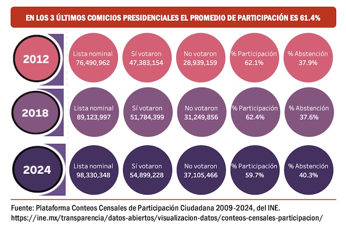 En general podríamos afirmar que el porcentaje de participación ciudadana en los res últimos procesos electorales presidenciales ha sido muy estable, pues promedia el 61.4 por ciento, aunque en cada contienda, entre 2012 y 2024, ha aumentado en números absolutos la presencia de ciudadanos en las urnas.