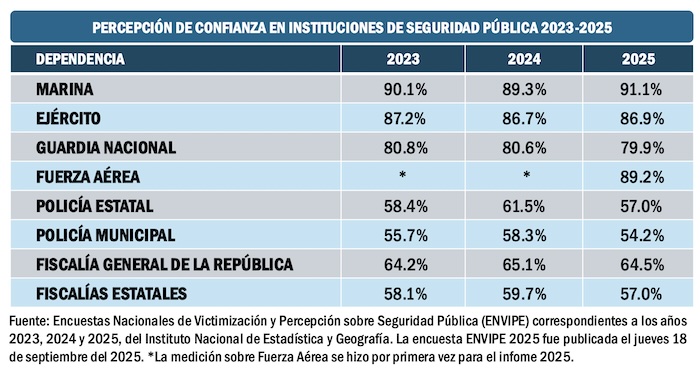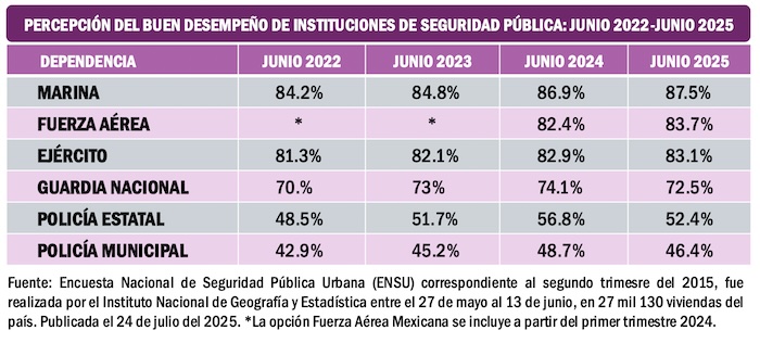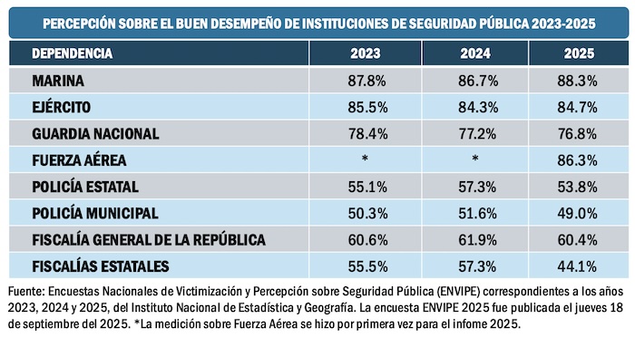 Tanto las Encuestas Nacionales de Victimización y Percepción sobre Seguridad Pública (ENVIPE) del INEGI, correspondientes a los años 2023, 2024 y 2025, como la Encuesta Nacional de Seguridad Pública Urbana (ENSU) correspondiente al segundo trimestre del 2025 corroboran que el desempeño de la Fuerza Armada Permanente es bien calificado, lo que no sucede con el trabajo de las policías estatales y municipales.