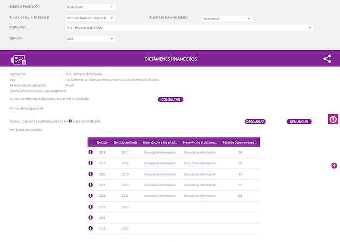 Fue después de ese año, cuando Morena tuvo más observaciones en su dictamen financiero, que el partido dejó de hacer públicos estos documentos.