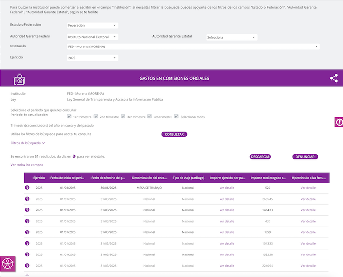 En abril de 2025 el partido dirigió a la solicitante a la PNT, pero la información no estaba disponible como la organización política aseguraba. Cinco meses después la situación es la misma: el partido publicó información sobre 51 comisiones oficiales realizadas en los primeros seis meses de este año, pero ninguna corresponde a López Beltrán.