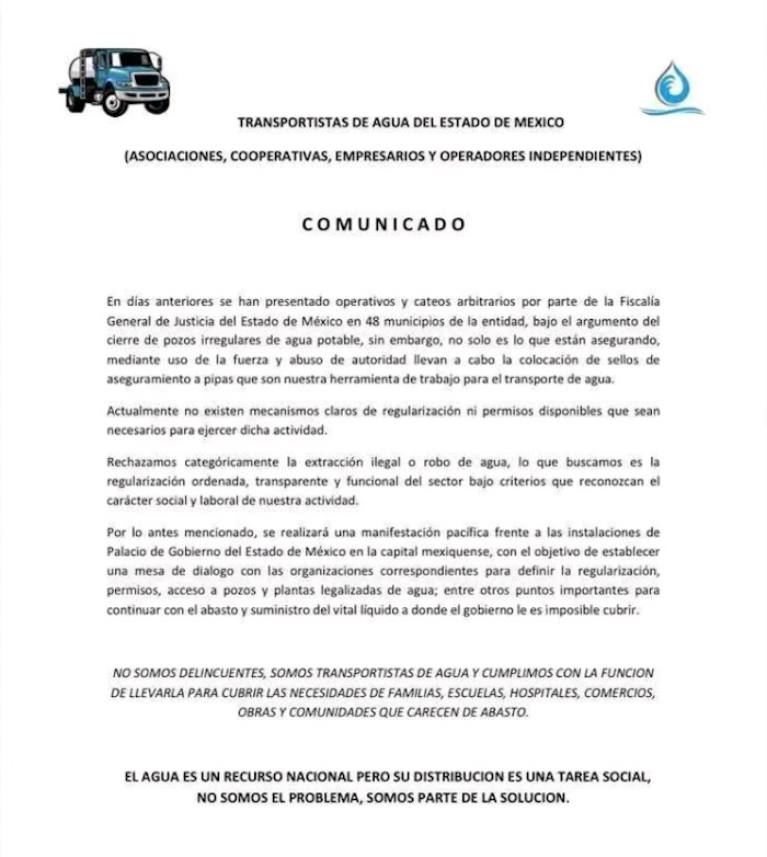 El comunicado de la autoridad estatal plantea que la ciudadanía es obligada a comprar esa agua –insalubre y a sobrecosto– solamente a los transportistas agremiados a alguna organización, para lo cual identifican sus transportes con logotipos y calcomanías.