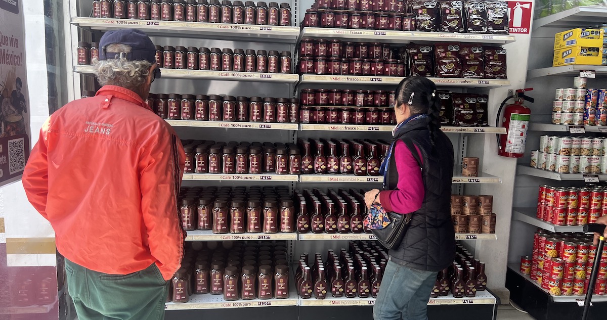 Son las 8:45 de la mañana. La tienda aún no abre en su totalidad, pero las cortinas de metal ya fueron levantadas, lo que permite que la gente ya esté asomándose tras los cristales. Las miradas se clavan con atención en los empleados que colocan cuidadosamente sobre los anaqueles frascos de tres productos: chocolate, miel y café. Todos llevan la misma etiqueta: la marca del Bienestar. Estos productos son, sin duda, los más buscados por quienes llegan desde temprano.