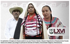 El caso más reciente de legislación referida a este grave problema es la aprobación de la Ley para Prevenir, Atender y Reparar Integralmente el Desplazamiento Forzado Interno en el Estado de Oaxaca, emitida por el Congreso estatal el 2 de septiembre del 2025, en la cual se señala que “el desplazamiento forzado interno es el hecho a través del cual una o varias personas, de forma individual, familiar o colectivamente se ven forzadas u obligadas a salir, escapar o a huir de su lugar de origen, sus tierras, territorios, o de su lugar de residencia habitual en el Estado de Oaxaca, porque su vida, su integridad física, su seguridad o libertades individuales han sido vulneradas, o se encuentran directamente amenazadas”.