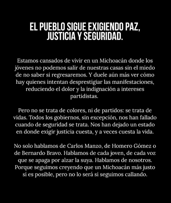 "Los jóvenes ya nos acostumbramos a crecer sabiendo que en Michoacán matan, que Michoacán es un estado peligroso, que en Michoacán salir después de cierta hora a la calle es inseguro y es muy riesgoso, y corremos el riesgo de no regresar a nuestras casas (...) Que sepan que todos tenemos miedo, la intriga de saber qué va pasar con nosotros, pero hay que hacer ruido porque queremos un Michoacán seguro, queremos vivir en un lugar en paz, no queremos vivir en la incertidumbre y 'qué tal si es mejor irme a otro país' y dejar a mi familia, no queremos eso", dijo desde Morelia, la estudiante de 24 años Lizbeth Hernández.