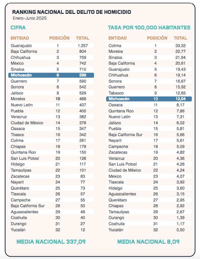 Las gráficas con datos recopilados por el Secretariado Ejecutivo muestran cómo el delito de extorsión en Michoacán pasó de 0.92 casos por cada 100 mil habitantes en 2015 a 5.90 casos en 2024, y los homicidios dolosos subieron de 16.35 casos por cada 100 mil habitantes en 2015 a 24.93 casos en 2024, con un pico importante en 2021.