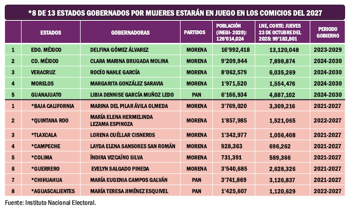 Ciudad de México, 4 de noviembre (SinEmbargo).- Ocho las 13 gubernaturas que están actualmente en manos de mujeres se pondrán en juego en los comicios del domingo 6 de junio del 2027. Las responsables de seis de esas ocho administraciones estatales son de Morena y dos pertenecen al Partido Acción Nacional (PAN).