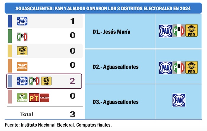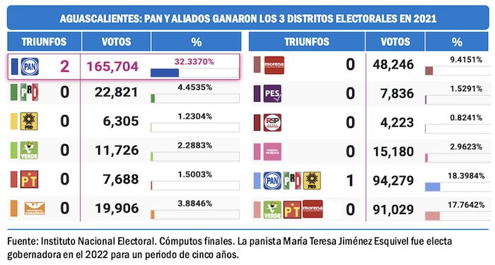 El voto panista más sólido de toda la República está en Aguascalientes, donde en el 2022 llegó a la gubernatura María Teresa Jiménez Esquivel. Tanto en los comicios del 2021 como en los del 2024, la coalición panista ha ganado los tres distritos electorales federales en esa entidad. El PAN conservará el poder en esa entidad en el 2027.