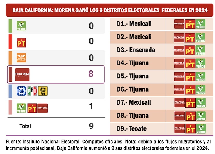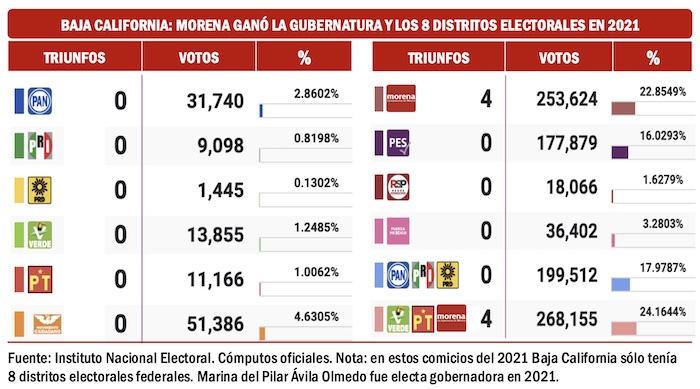 La supremacía de Morena y sus aliados es muy estable en Baja California. En 2021, además de ganar la gubernatura con Marina del Pilar Ávila Olmedo, Morena y sus aliados triunfaron en los 8 distritos electorales federales que se disputaron. En 2024 los distritos electorales en Baja California aumentaron a 9 y nuevamente, todos los ganó la coalición morenista.