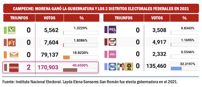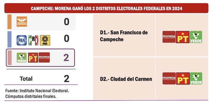 Pese a lo controversial que ha sido la administración de Layda Sansores San Román, quien llegó a la gubernatura de Campeche en 2021, Morena y sus aliados han ganado los dos distritos electorales federales de la entidad en las elecciones de 2021 y 2024. Sin embargo, una alianza electoral de Movimiento Ciudadano con el PAN sí podría inquietar a Morena y sus aliados en la contienda por la Gubernatura de Campeche en el 2027.
